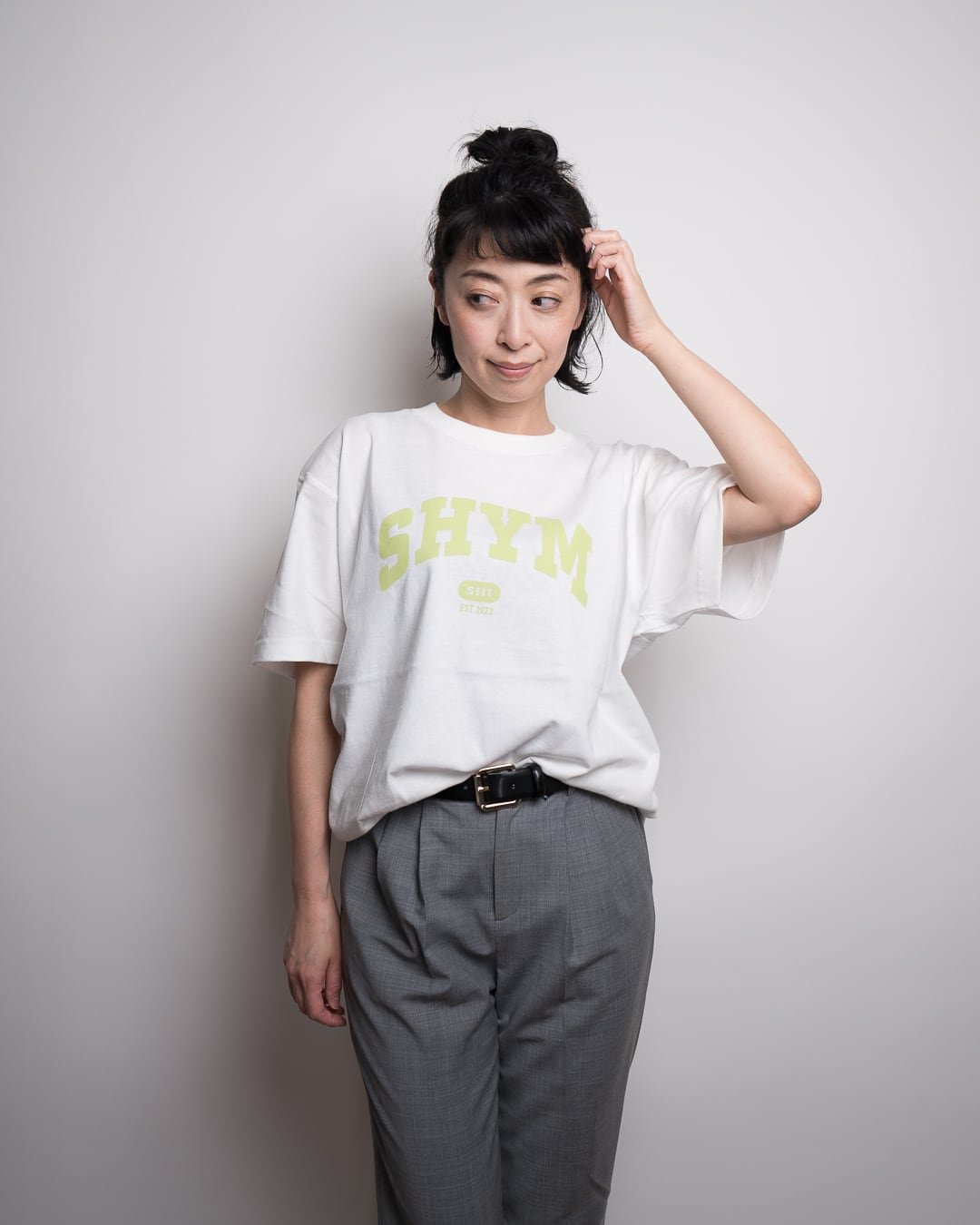siiiーhayamaを略した“SHYM”のカレッジロゴシリーズからキッズと同デザインのバニラホワイトTシャツで2色展開!親子でお揃いにできるシリーズです。